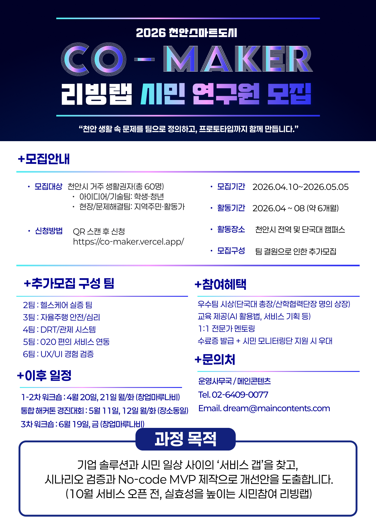 천안 생활 속 문제를 팀으로 정의하고, 프로토타입까지 함께 만듭니다.